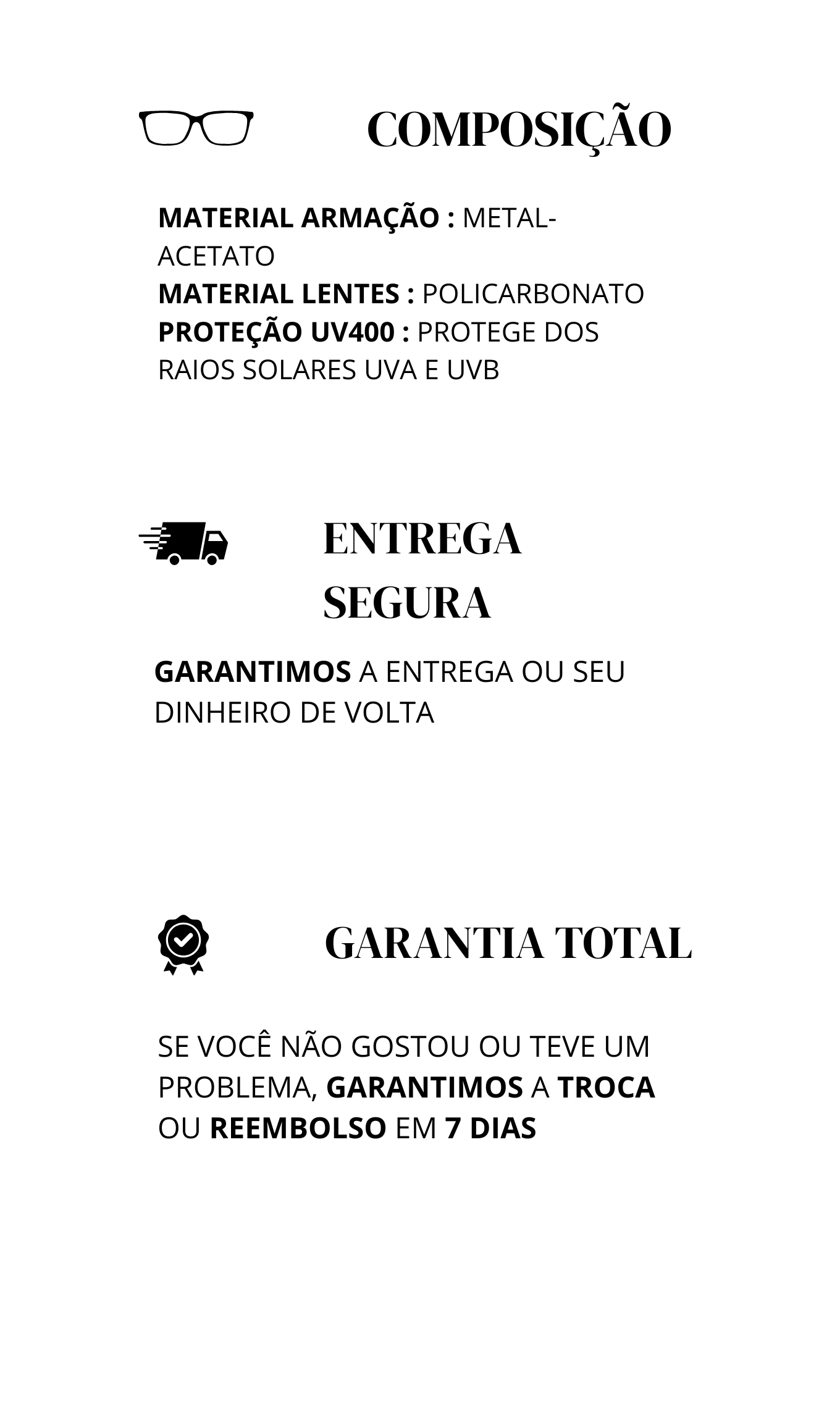 Produzido em acetato premium, garante conforto, resistência e acabamento impecável. As lentes em policarbonato com proteção UV400 bloqueiam 100% dos raios UVA e UVB, oferecendo máxima segurança e nitidez visual.